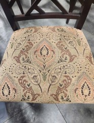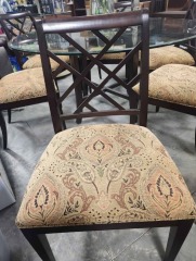 Round glass top table with 6 chairs. Wood is in good condition. Table measures 5ft in diameter. Each chair measure 18"L X 21"W X 19"H